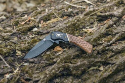 - 440C stainless steel drop point blade with dark black oxide stonewashed finish
