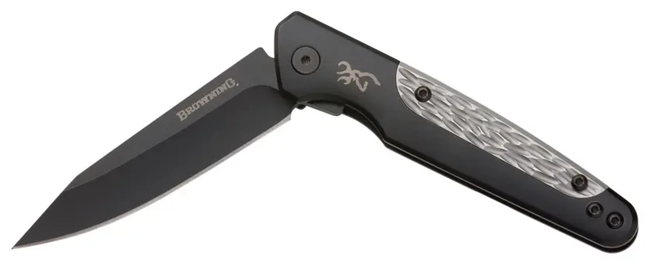 - Black titanium-coated stainless steel handle scales with textured stainless steel insert