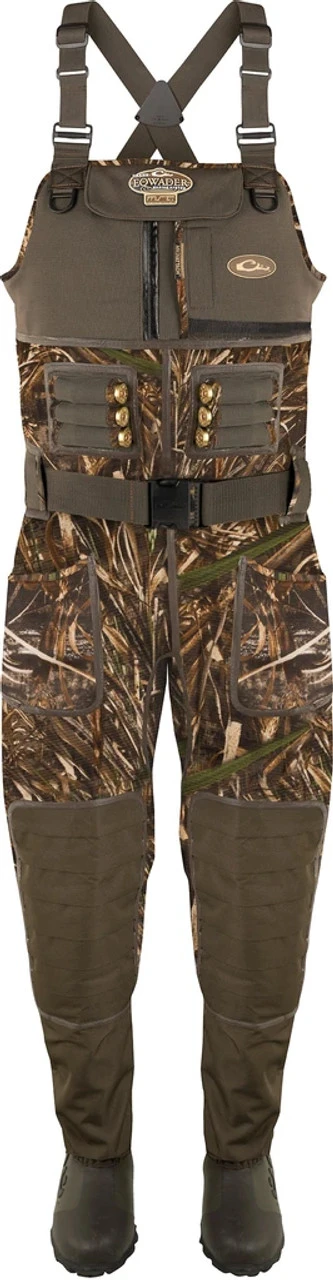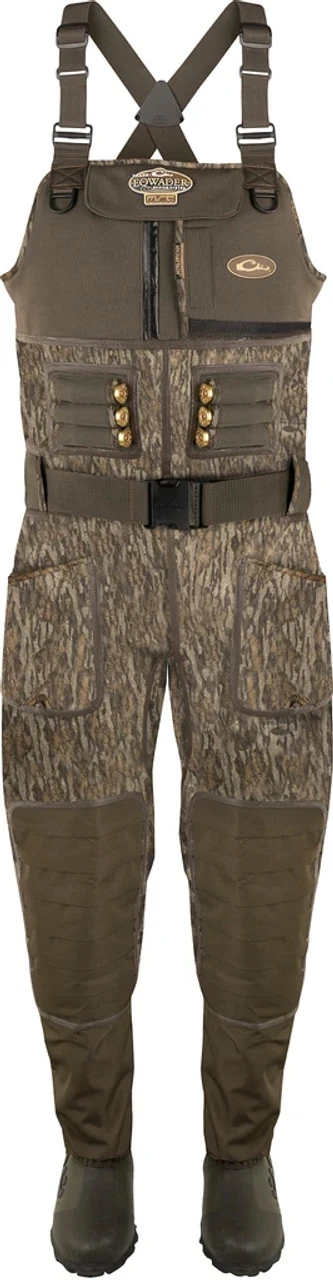 Drake designed the Eqwader Wading System 2.0 to be the most dependable neoprene wader on the market. To achieve this, they took our construction above and beyond the competition and covered ALL external seams with a unique LIQUID SEAM WELD and ALL internal seams with extra-wide WATERPROOF SEAM-SEAL TAPE. Other waders on the market only use one of these methods, or they only apply them to “critical” seams around the knees and crotch. Waterfowl hunters are exposed to the worst elements day-in and day-out. So aren’t all seams on a wader critical? Utilizing BOTH methods on ALL seams in addition to traditional seam gluing and stitching ensures maximum top-to-bottom protection not found anywhere else. Drake also combined DryFuse Seam Technology with additional comfort features such as higher sides, two front “High Ground” pockets, Hydro-Flex knee pads to reduce tension on the seams when kneeling or sitting, and our lightweight, extremely comfortable Buckshot Mudder boots with a snug ankle fit to prevent pull out when bogged down in the mud. Add in our proven Instinctive Features and you’ve got top of the line neoprene hunting waders that will outperform all others.