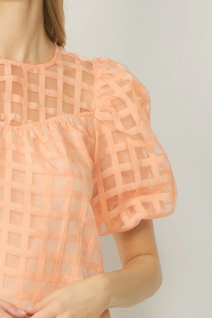 Grid print round neck puff sleeve top featuring keyhole button closure at back. Lined. Woven. Semi-sheer. Lightweight.
