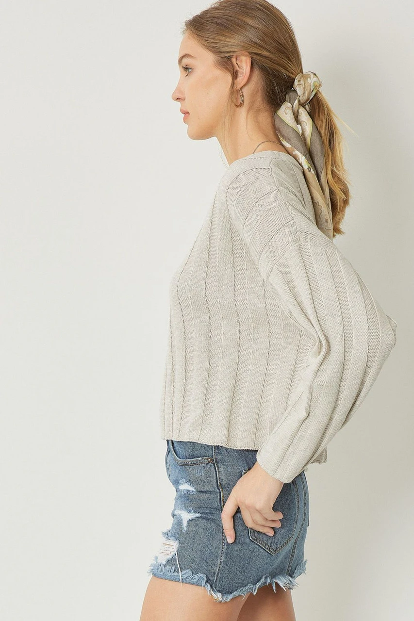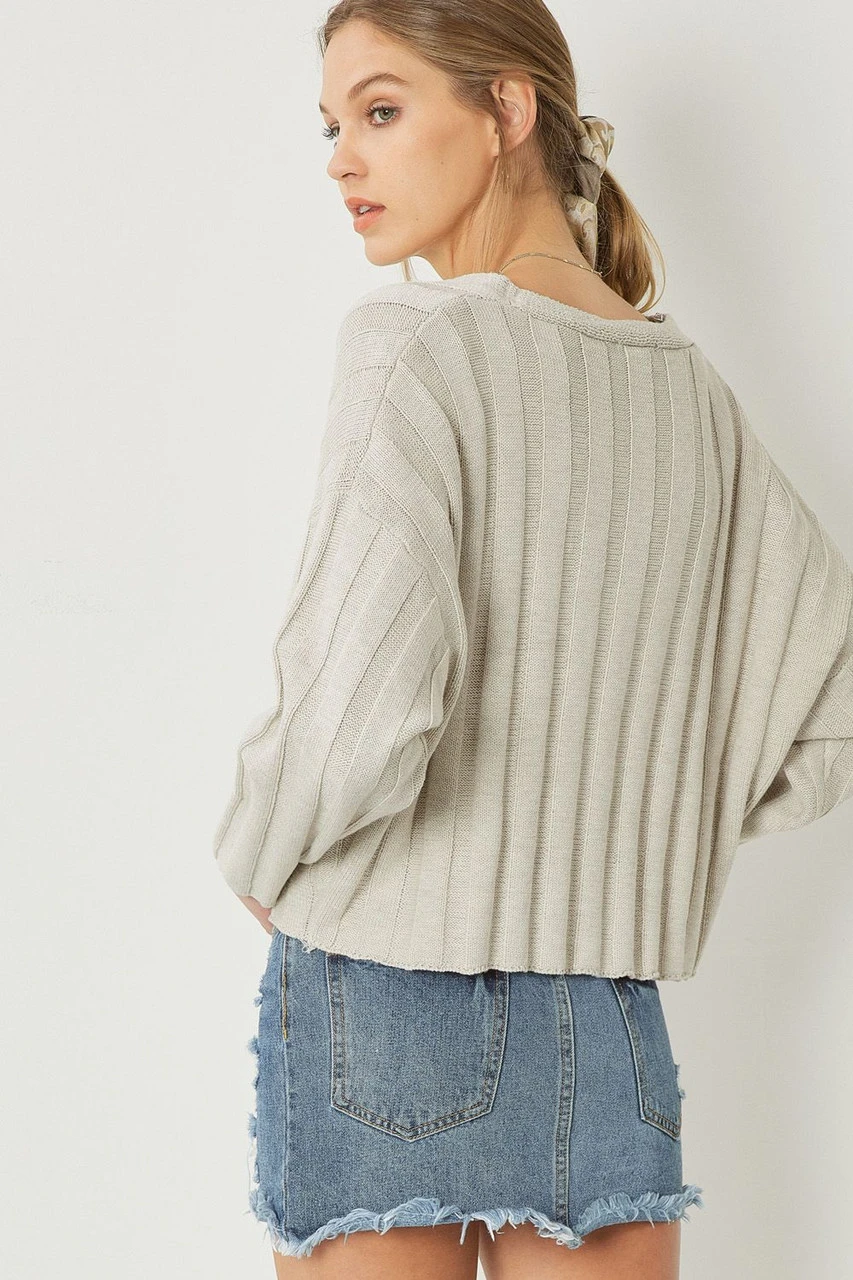 Solid ribbed v-neck long sleeve sweater featuring cropped silhouette. Unlined. Knit. Non-sheer. Mediumweight.