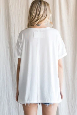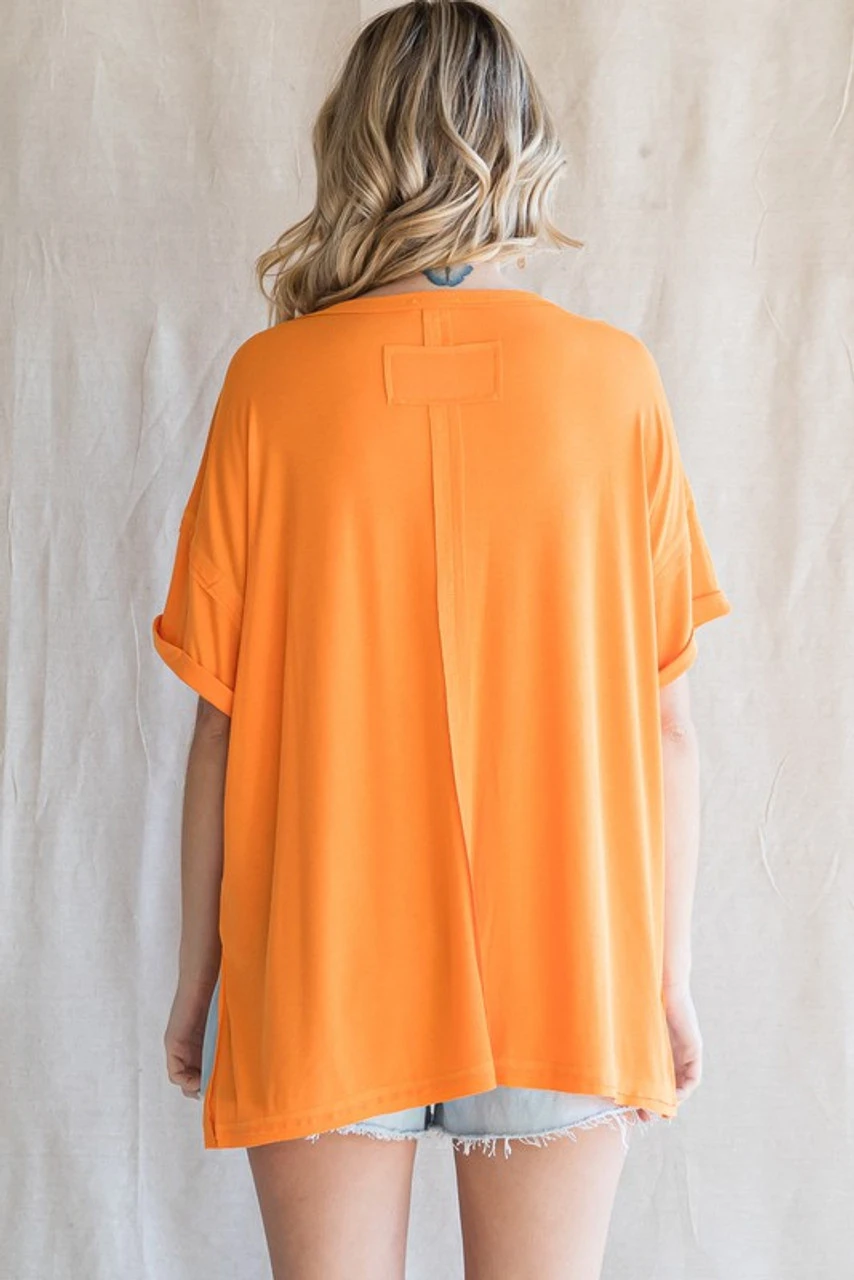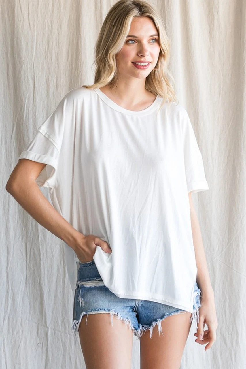 Solid top with a U-neck, cuffed add hems and short sleeves, side slit detail. -Unlined, non-sheer, lightweight. - Model is 5'8'' and is wearing a Small.