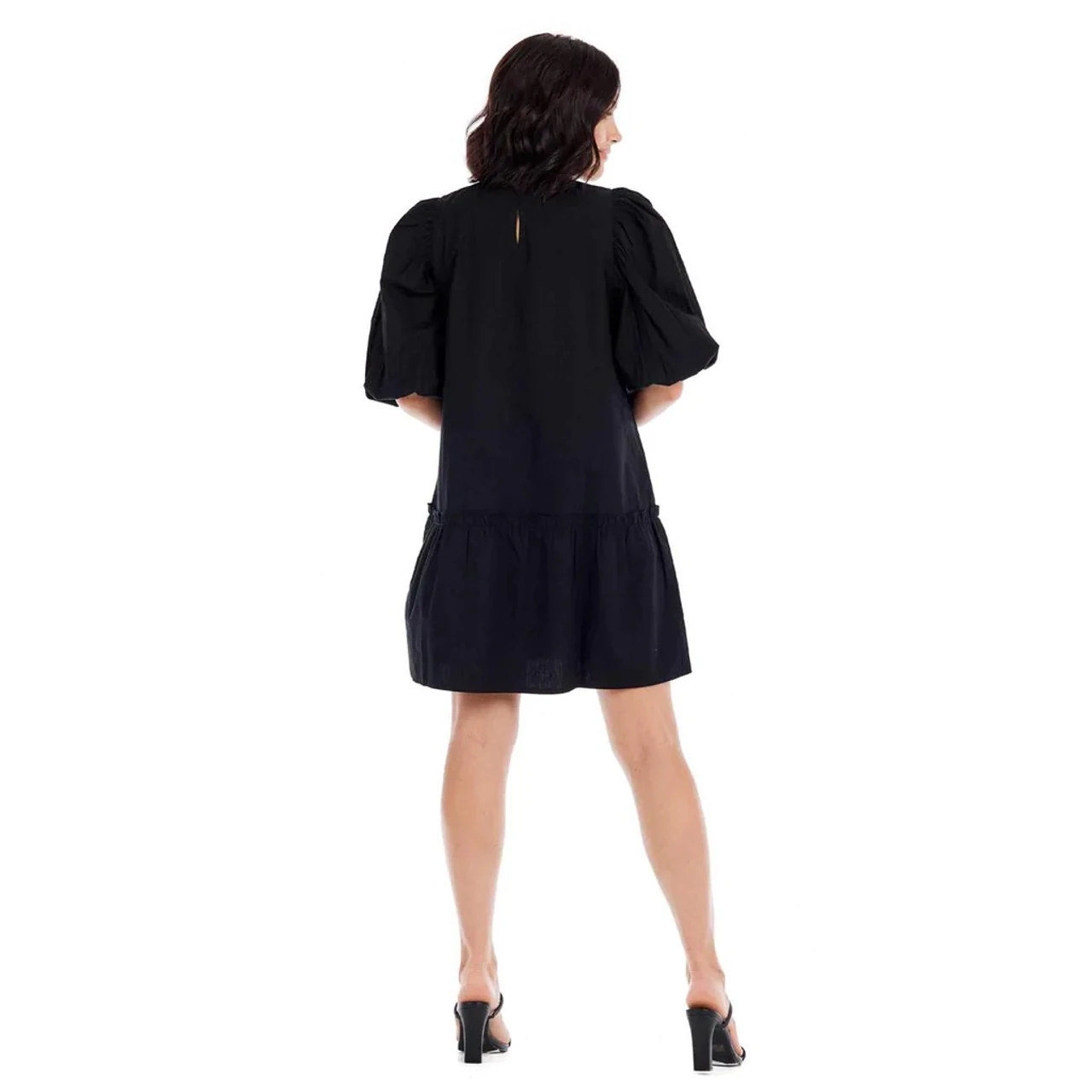 Cotton poplin dress features puff sleeves, ruffle neckline and flounce hem. Measures approximately 36″ from shoulder to hem on size small.