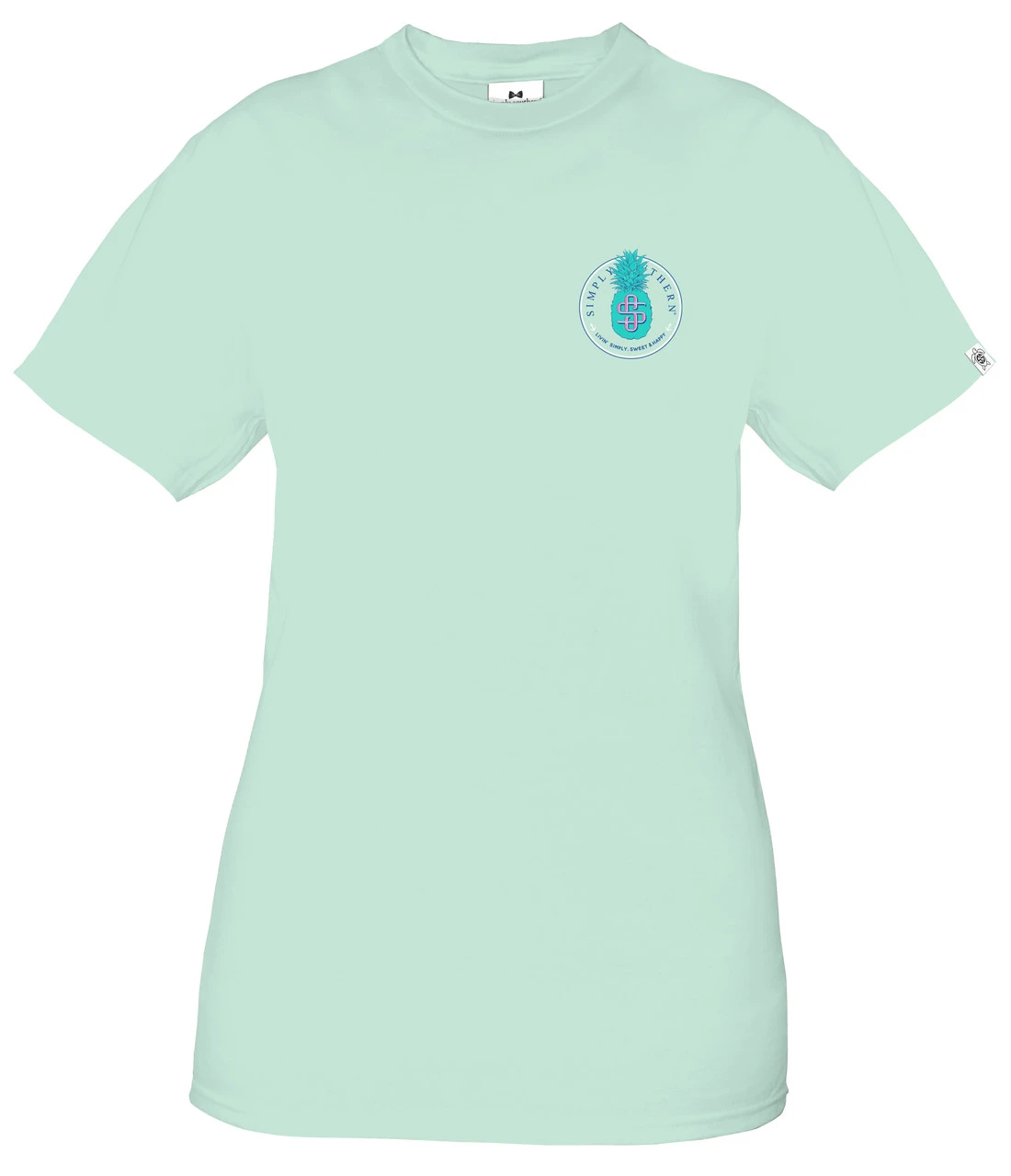 Pastel green short sleeve shirt with the phrase LIVIN SIMPLY SWEET AND HAPPY below a pineapple. The body of the pineapple shows a tropical scene at sunrise with baby sea turtles crawling down the beach. Simply Southern logo is below and on left chest. Pre-shrunk and ring-spun 100% cotton. Unisex sizing.