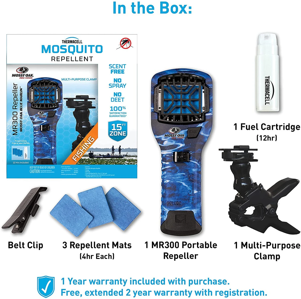 - TURN IT ON… MOSQUITOES GONE: Thermacell MR300 Portable Mosquito Repellent creates a 15-foot zone of protection against mosquitos. In Mossy Oak Red Hook Camo, this repeller is ideal for fishing of all kinds, canoeing, kayaking, and more.