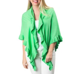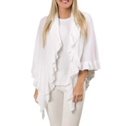 The Ava Ruffle Wrap has a ruffle trim for a feminine touch and layers beautifully over everything in your closet. Whether you are traveling, working in the office or out on the town, Ava has the style, warmth and versatility you will love. The triangle shape and tapered point in the back offer you a fabulous tailored look.