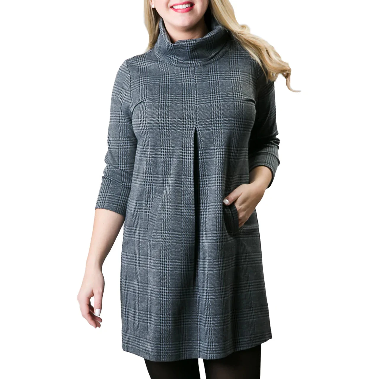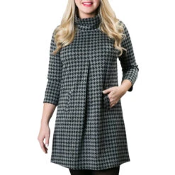 Everyone’s favorite! The Meghan flatters every body! And she has pockets! Three quarter sleeves, front pleat and loose-fitting turtleneck. Perfect with tights and booties, or over leggings with your favorite sneakers. Stretch jacquard fabric. Model is 5’8″ and wearing a size Medium