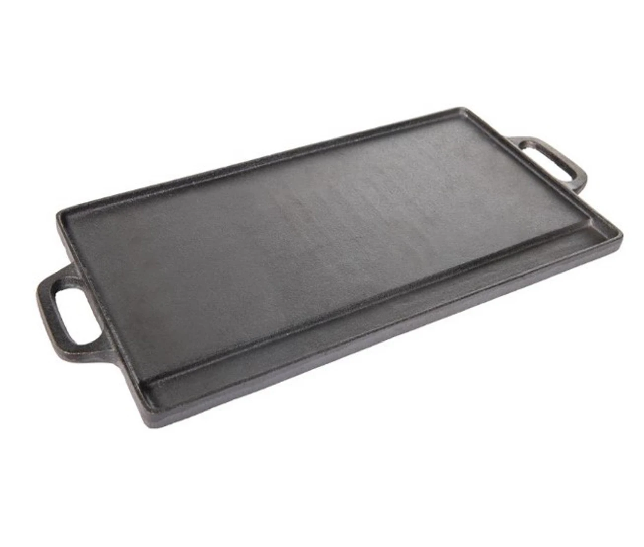 This versatile piece of cast iron cooking equipment makes cooking outdoors simple. Its pre-seasoned, double sided and distributes heat evenly for epic grilling experiences. The ribbed side separates the fat content like a BBQ and is great for searing a steak, grilling chicken or burgers and bacon. The smooth side is perfect for cooking pancakes, hash browns and grilled cheese.