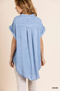 Washed Button Up Short Sleeve Top with Frayed Hemline
