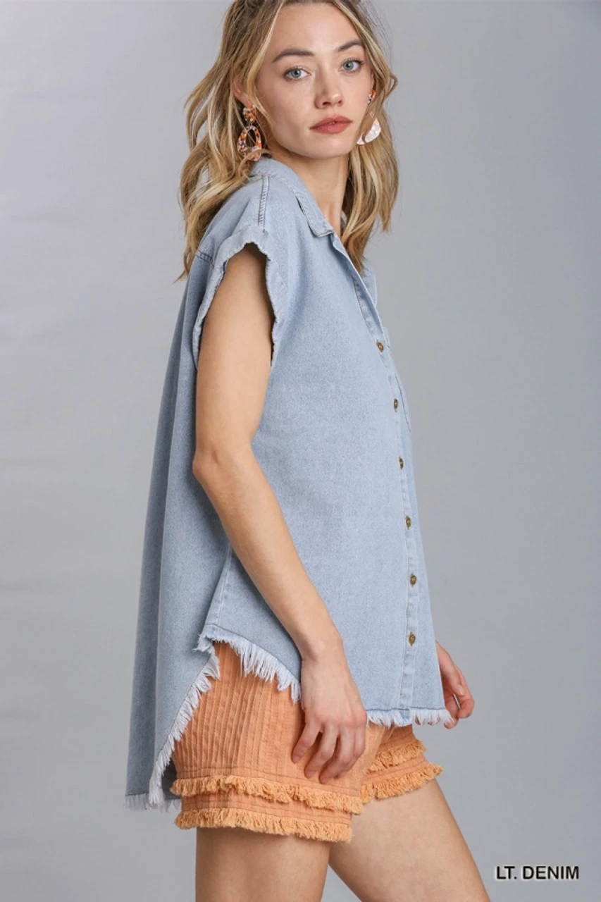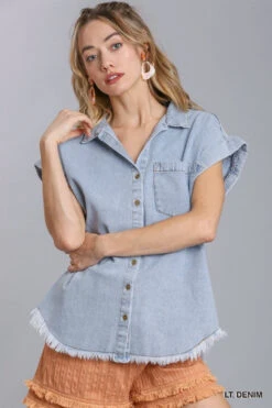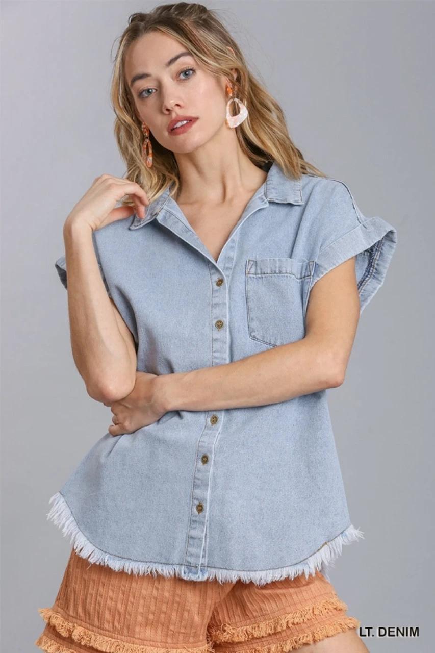 Denim Button Up Collared Short Sleeve Top with Chest Pocket and Frayed Hemline