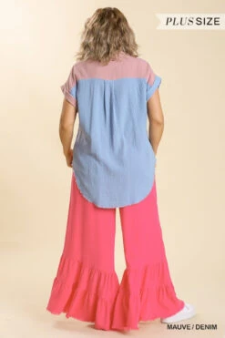 Umgee Plus Size Color Block Folded Sleeve Top – Mauve/Denim