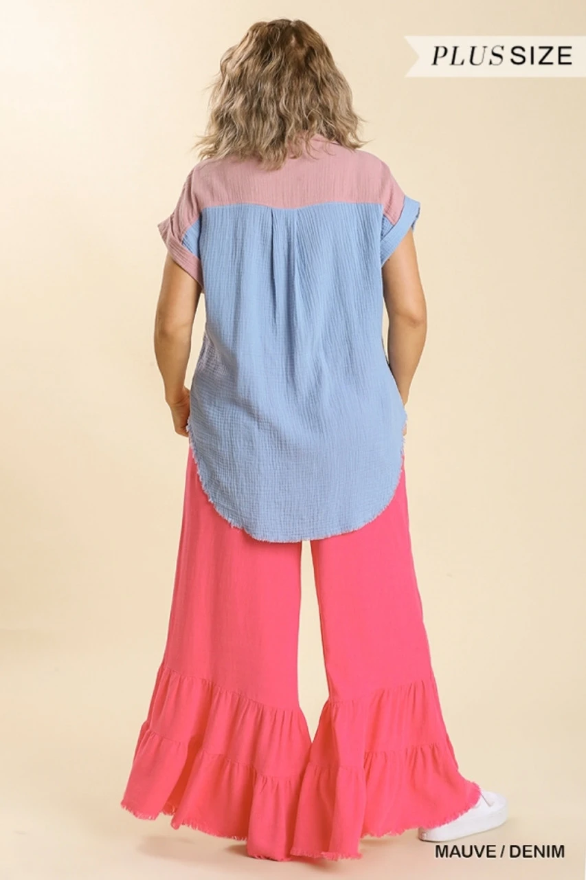 Color Block Gauze Button Up Short Folded Sleeve Top with Chest Pocket and Frayed Hemline