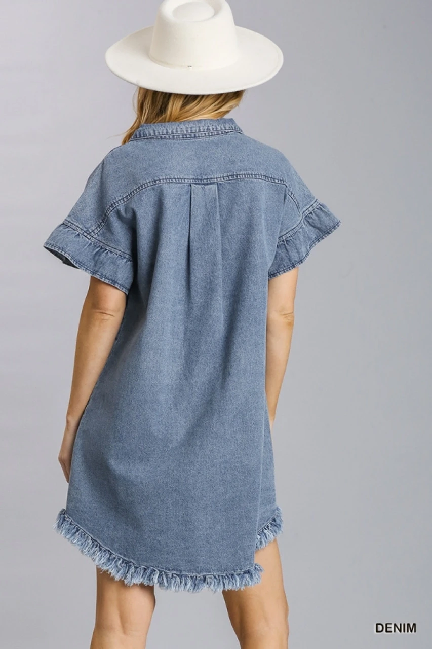 Button Down Short Ruffled Sleeve Shirt Denim Dress with Frayed Hem