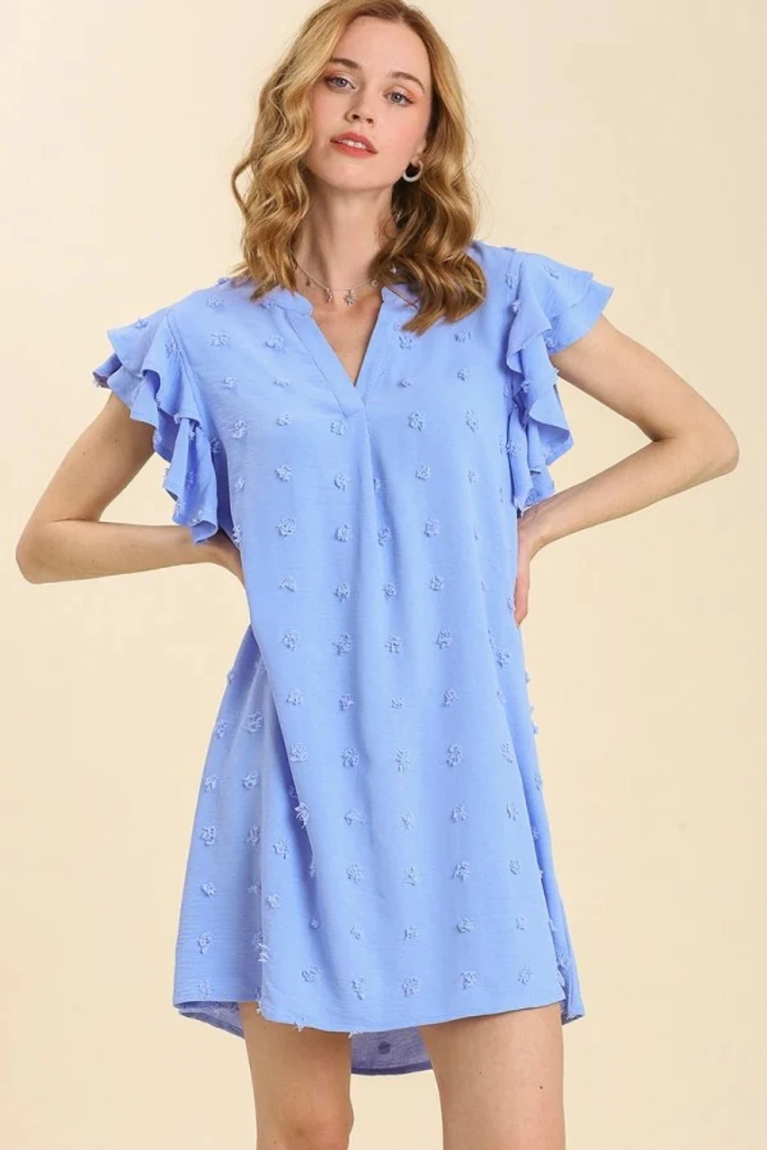 Umgee Swiss Dot V-Neck Dress with Double Ruffled Sleeves