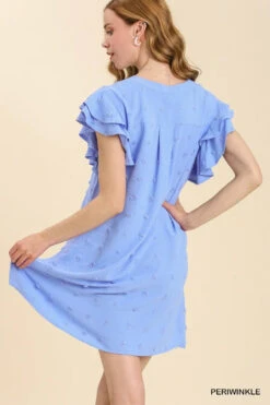 This Umgee dress features swiss dot fabric and double ruffled sleeves. It features a v-neck lined with a short collar. The material is very soft and has a loose fit so it doesn’t cling to the body . This is a perfect everyday dress and you will want one in every color. This is the perfect dress to pair with sneakers and a light jacket for that casual style look.
