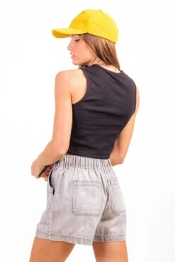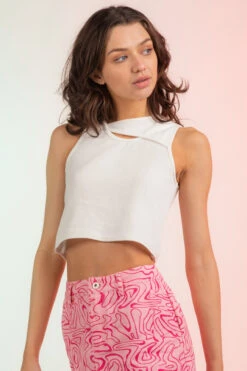 -Sleeveless Solid Knit Cutout Neck Crop Top -Asymmetrical Cutout Neck Detail -Cropped Length